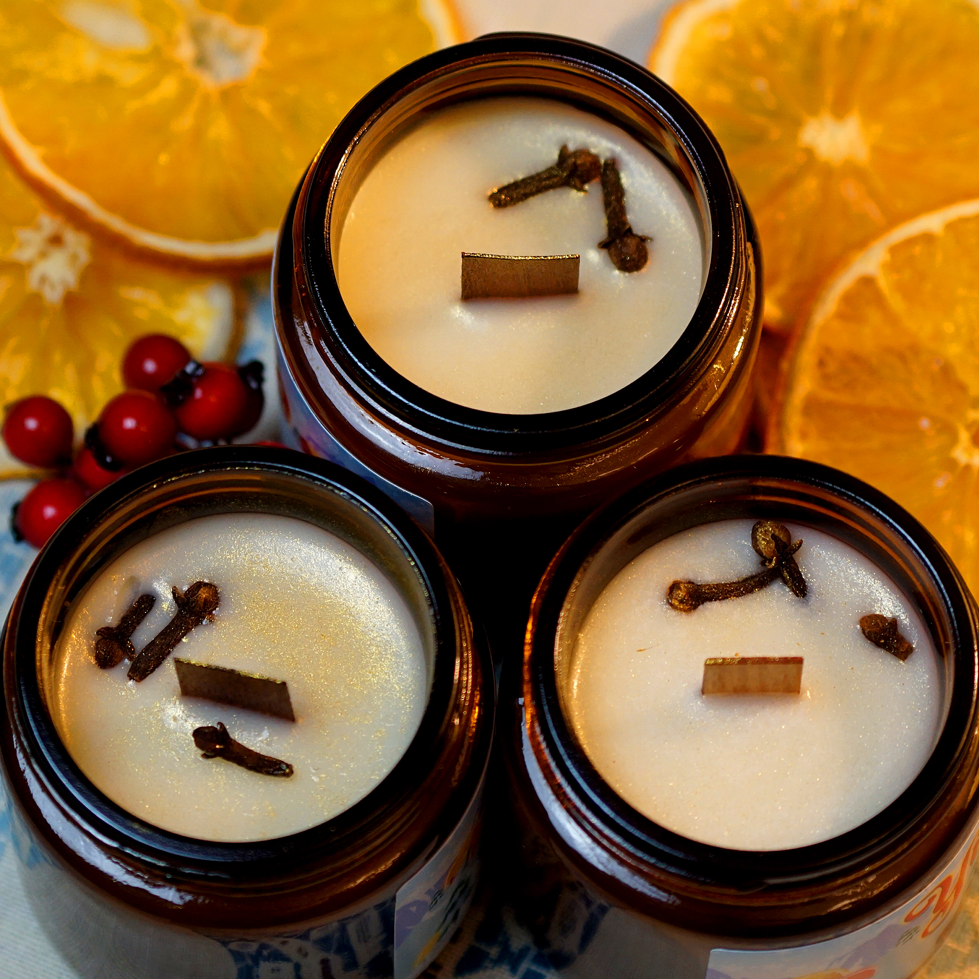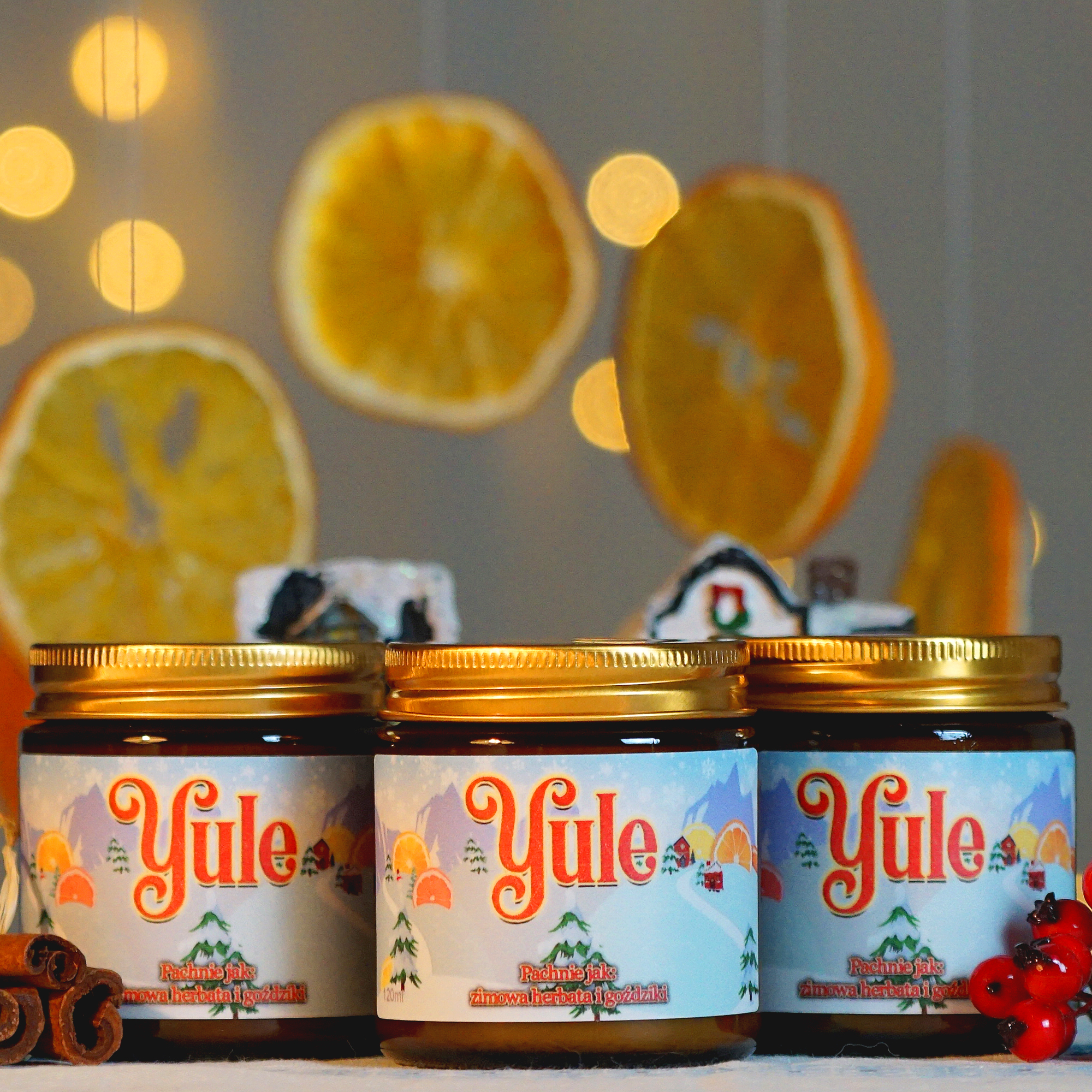 Zestaw trzech, świątecznych świec sojowych o zapachu zimowej herbaty i goździków. Wypełnią pomieszczenie ciepłym i przytulnym aromatem cytrusów i korzennych przypraw.
