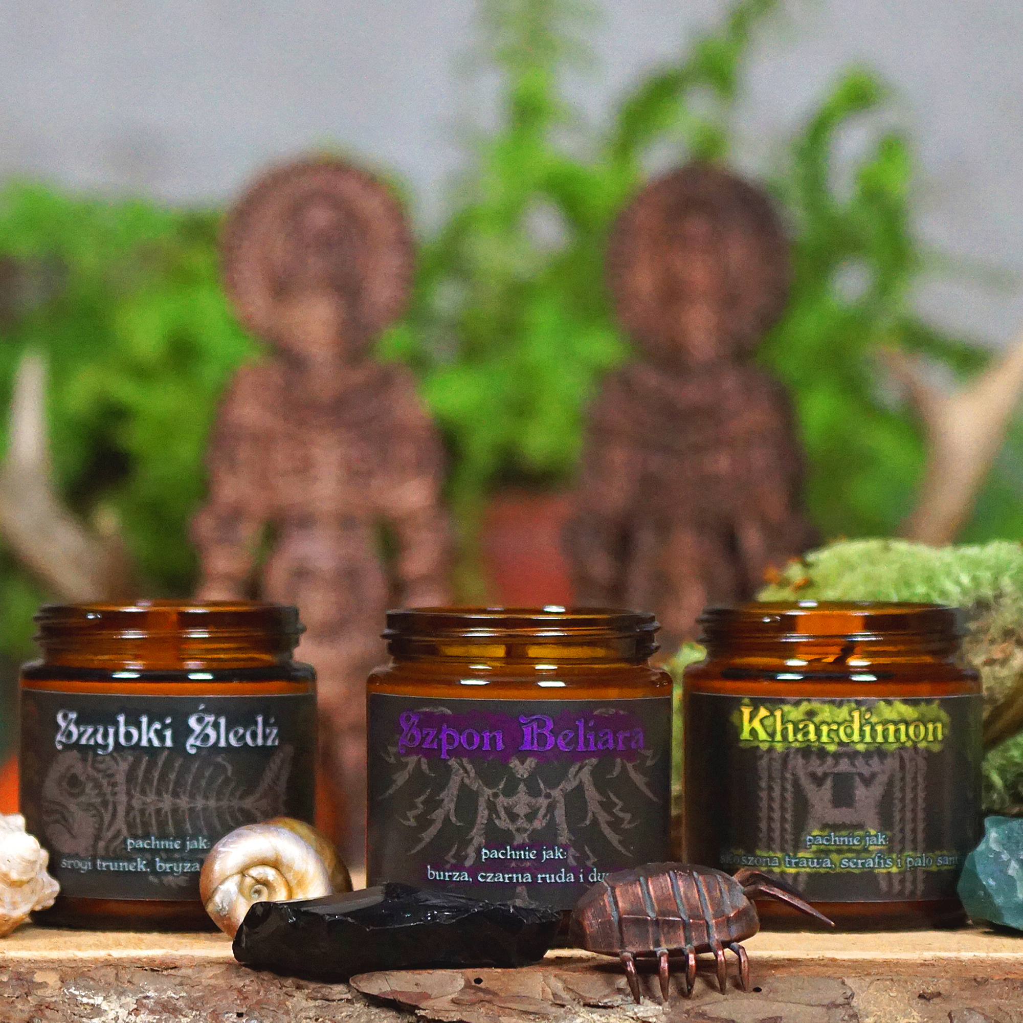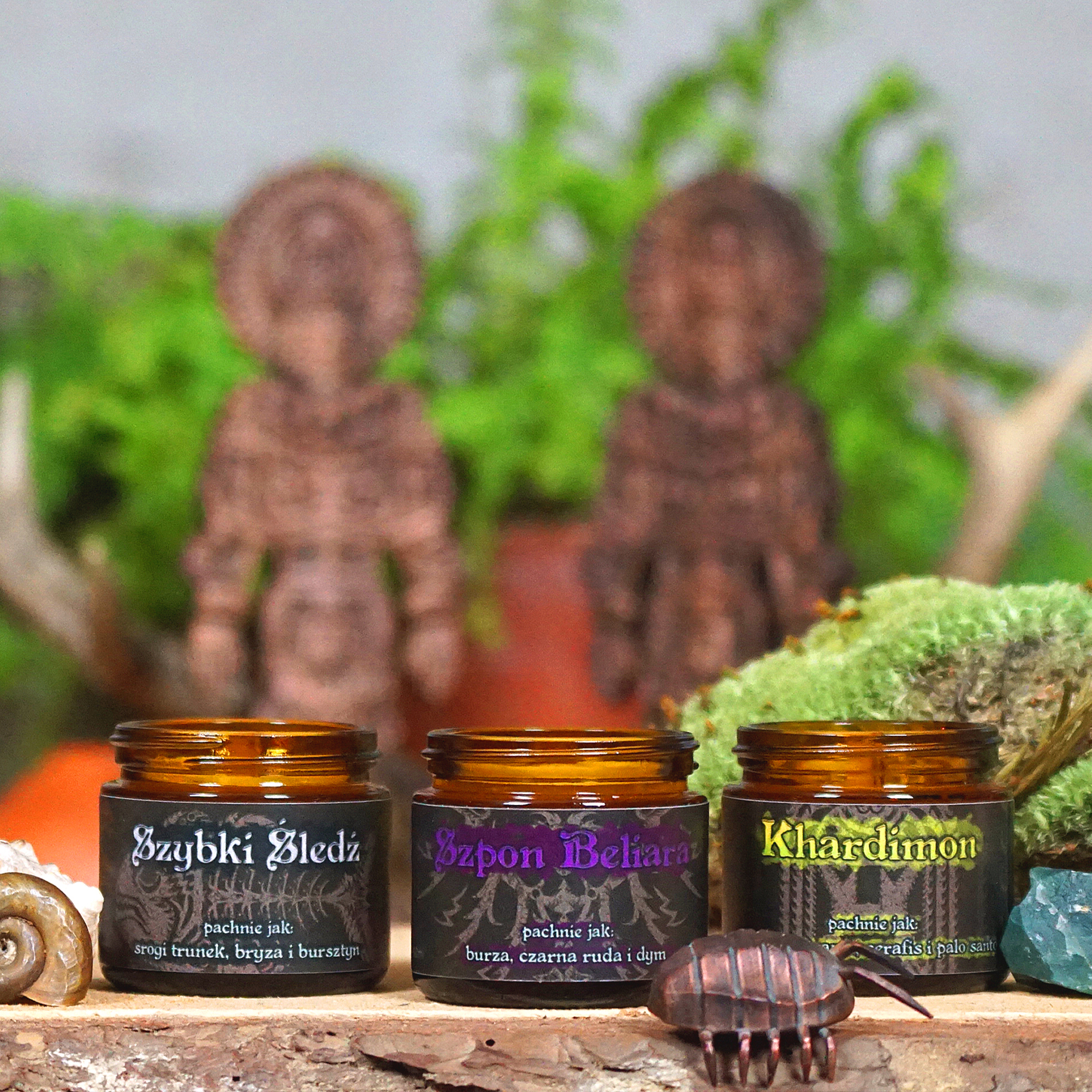 Zestaw trzech, ręcznie produkowanych świeca sojowych. Inspirowane grą Gothic 2 Noc Kruka.